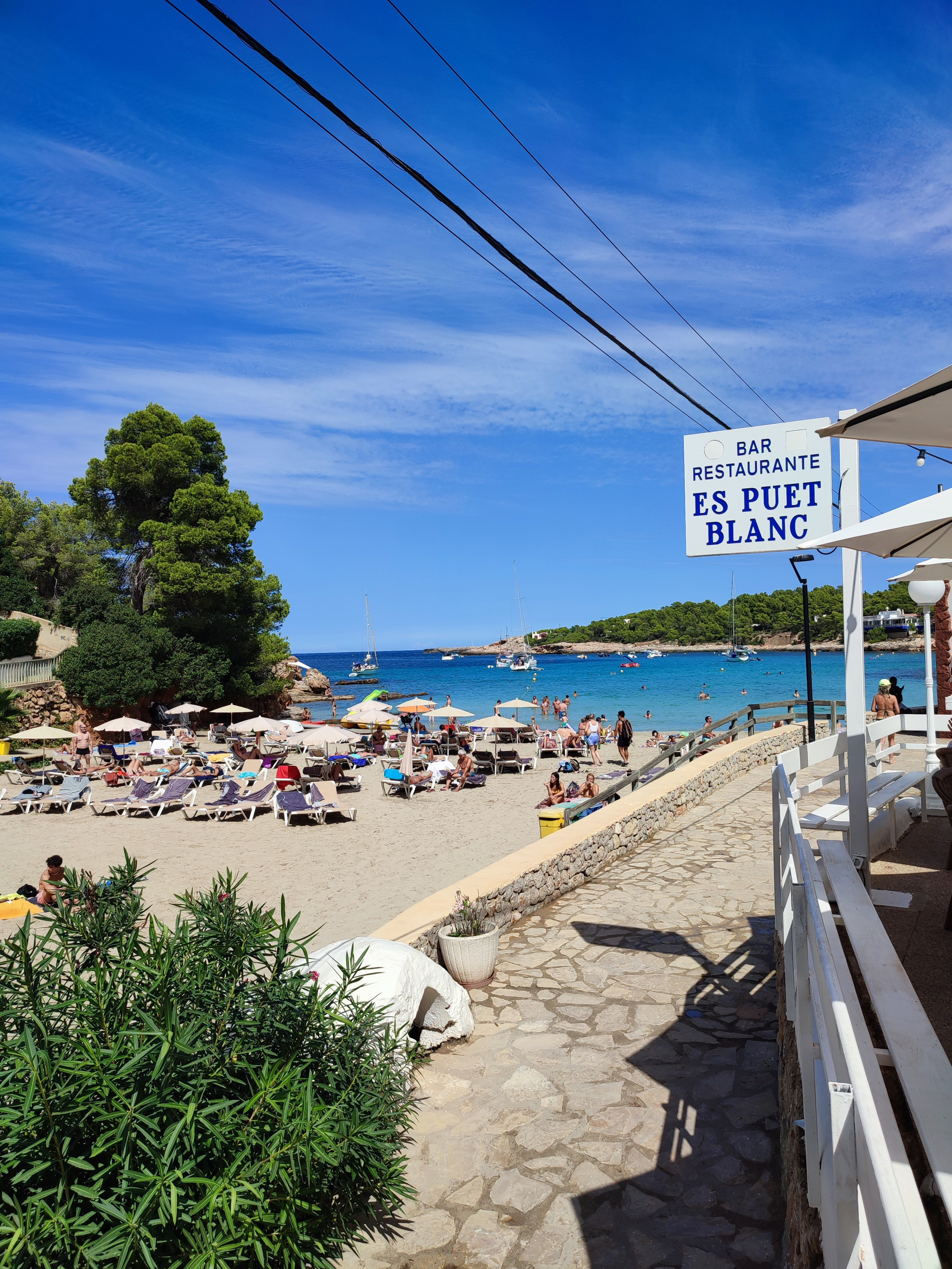 El sitio es inmejorable junto a una de las calas más bonitas de Ibiza. Tienes absolutamente de todo junto al edificio, restaurantes, súper, etc