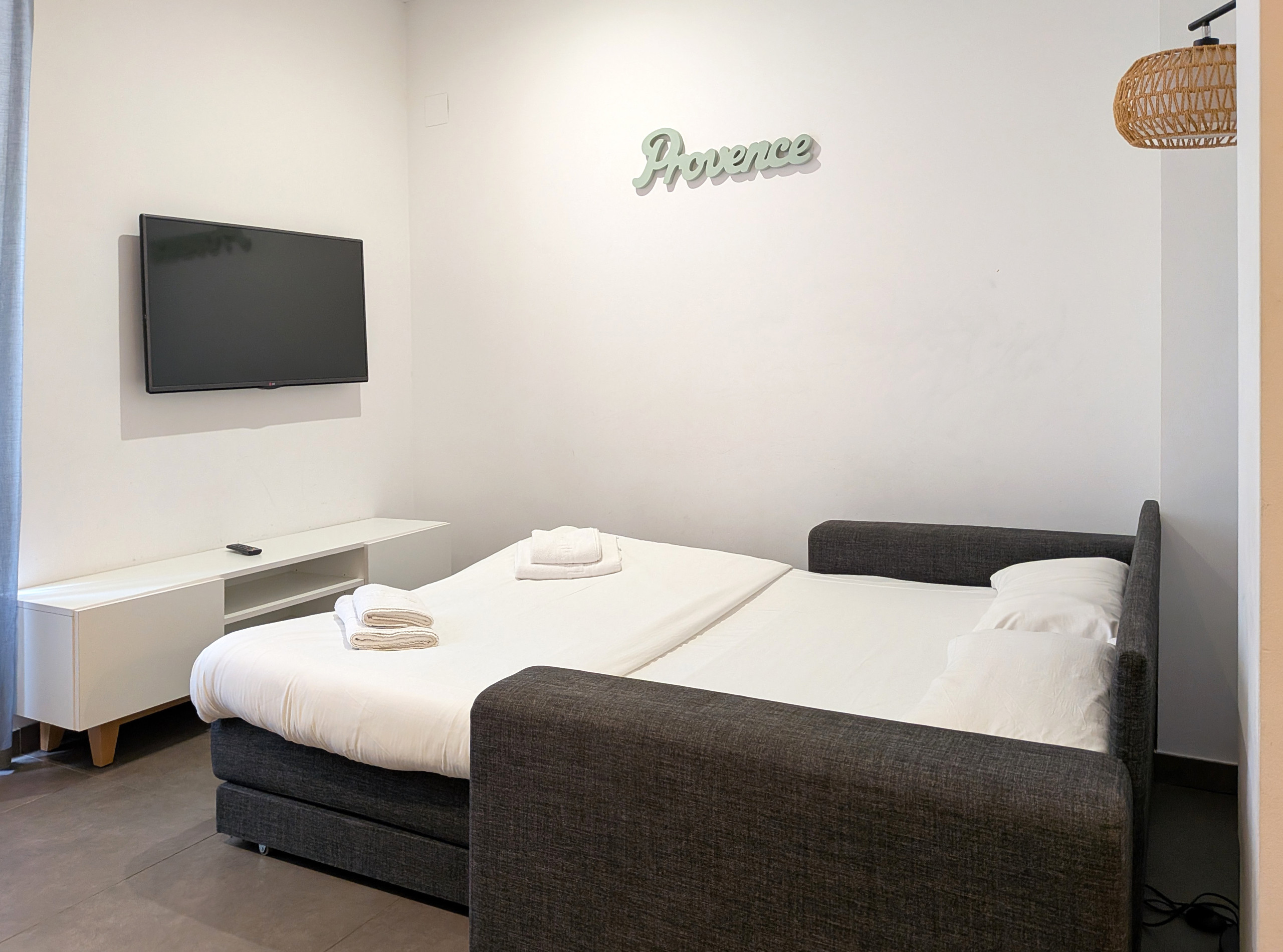 L'appartement a une capacité pour quatre personnes, avec une chambre double (option lit double ou deux lits simples sous réserve de disponibilité) et un canapé-lit double dans le salon. Il a une cuisine entièrement équipée, une salle de bain avec douche et deux télévisions.