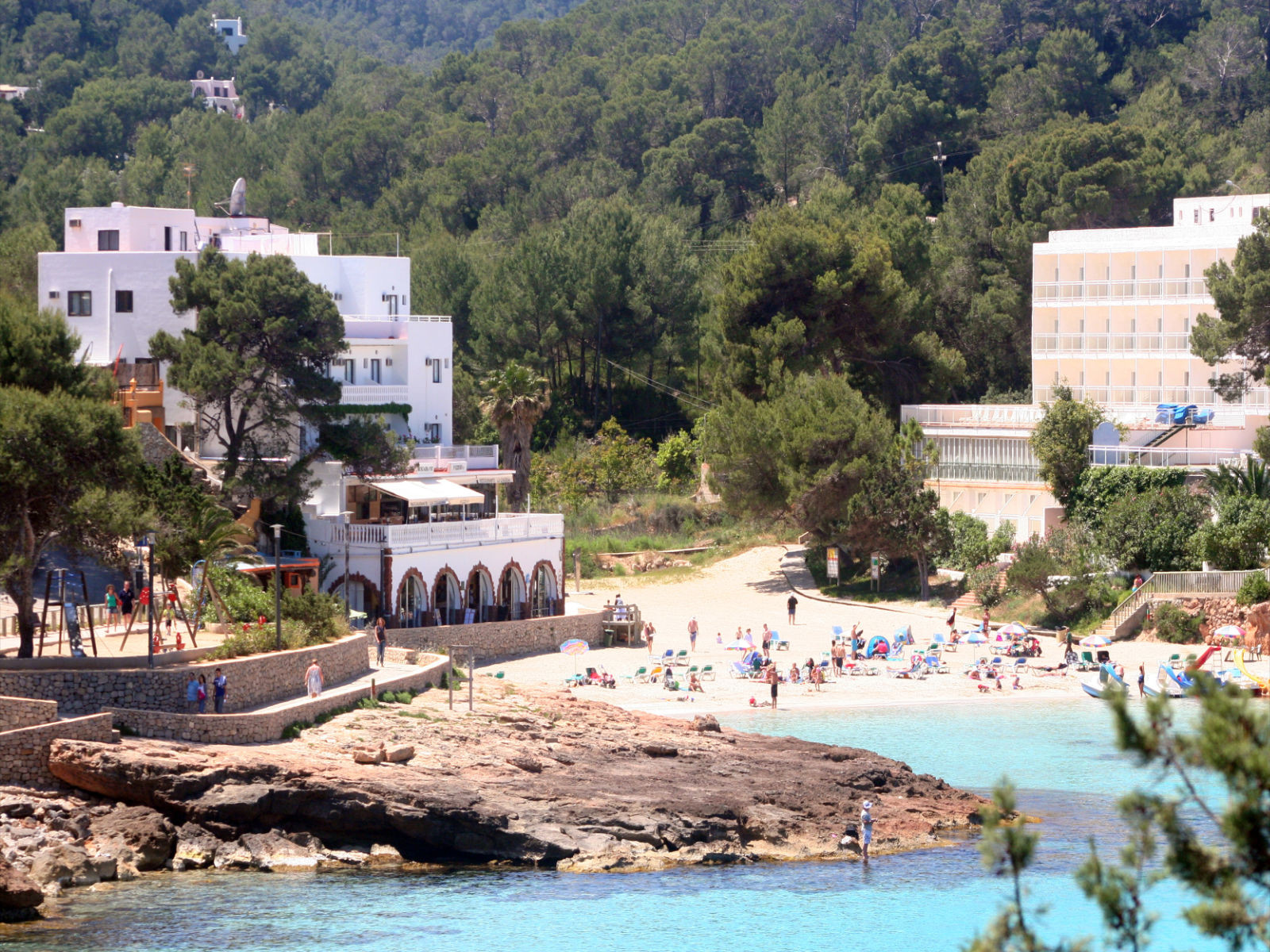 El sitio es inmejorable junto a una de las calas más bonitas de Ibiza. Tienes absolutamente de todo junto al edificio, restaurantes, súper, etc