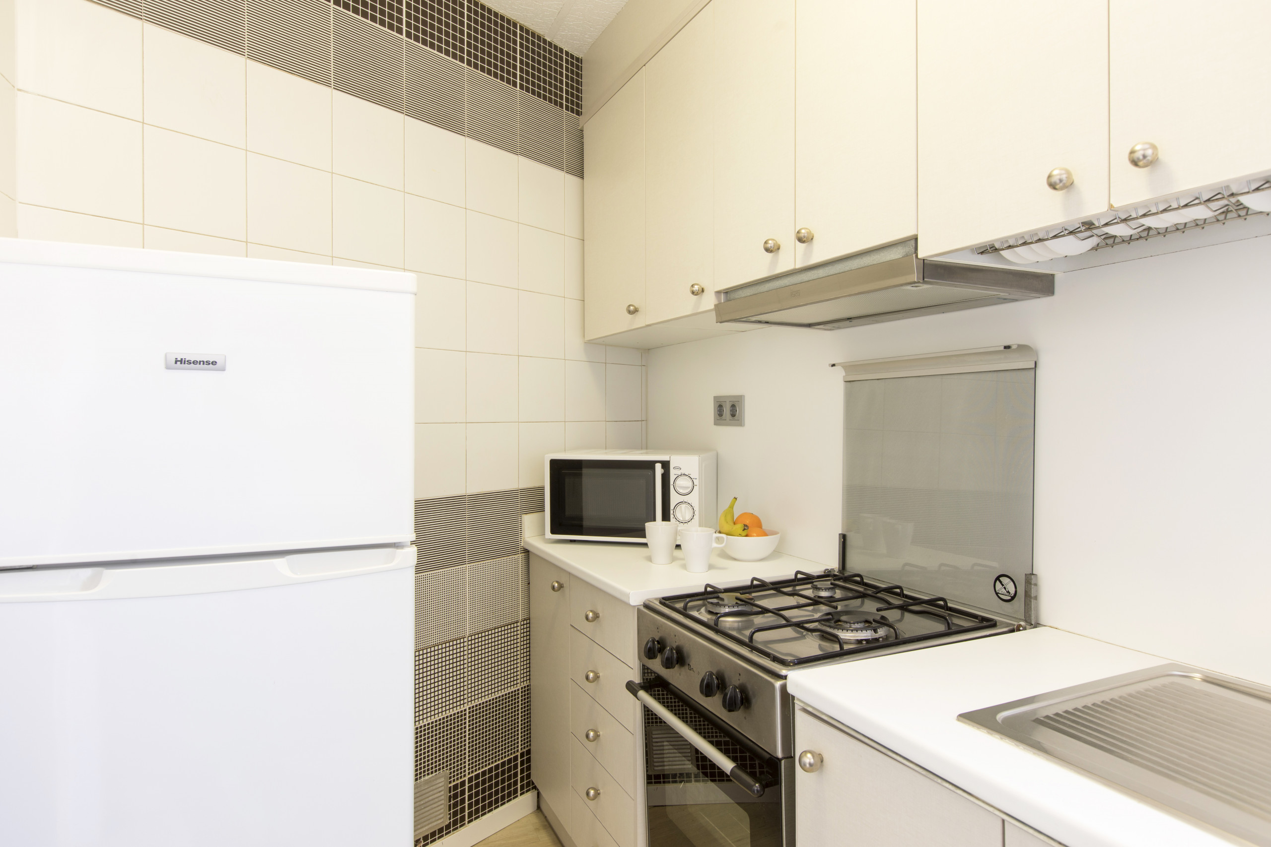 Cocina bastante amplia y completa para un apartamento. Nevera grande. Y por supuesto la terraza |